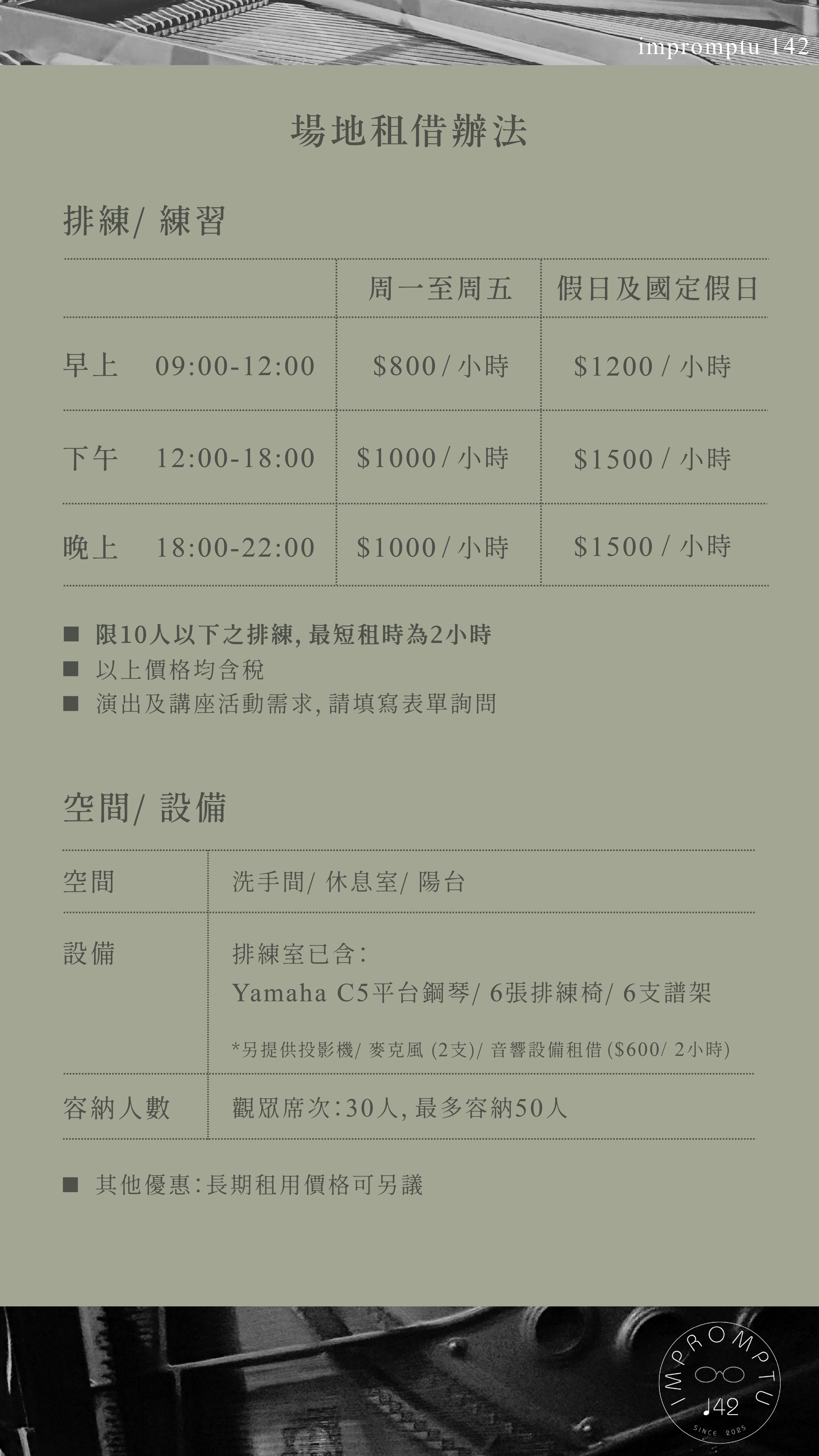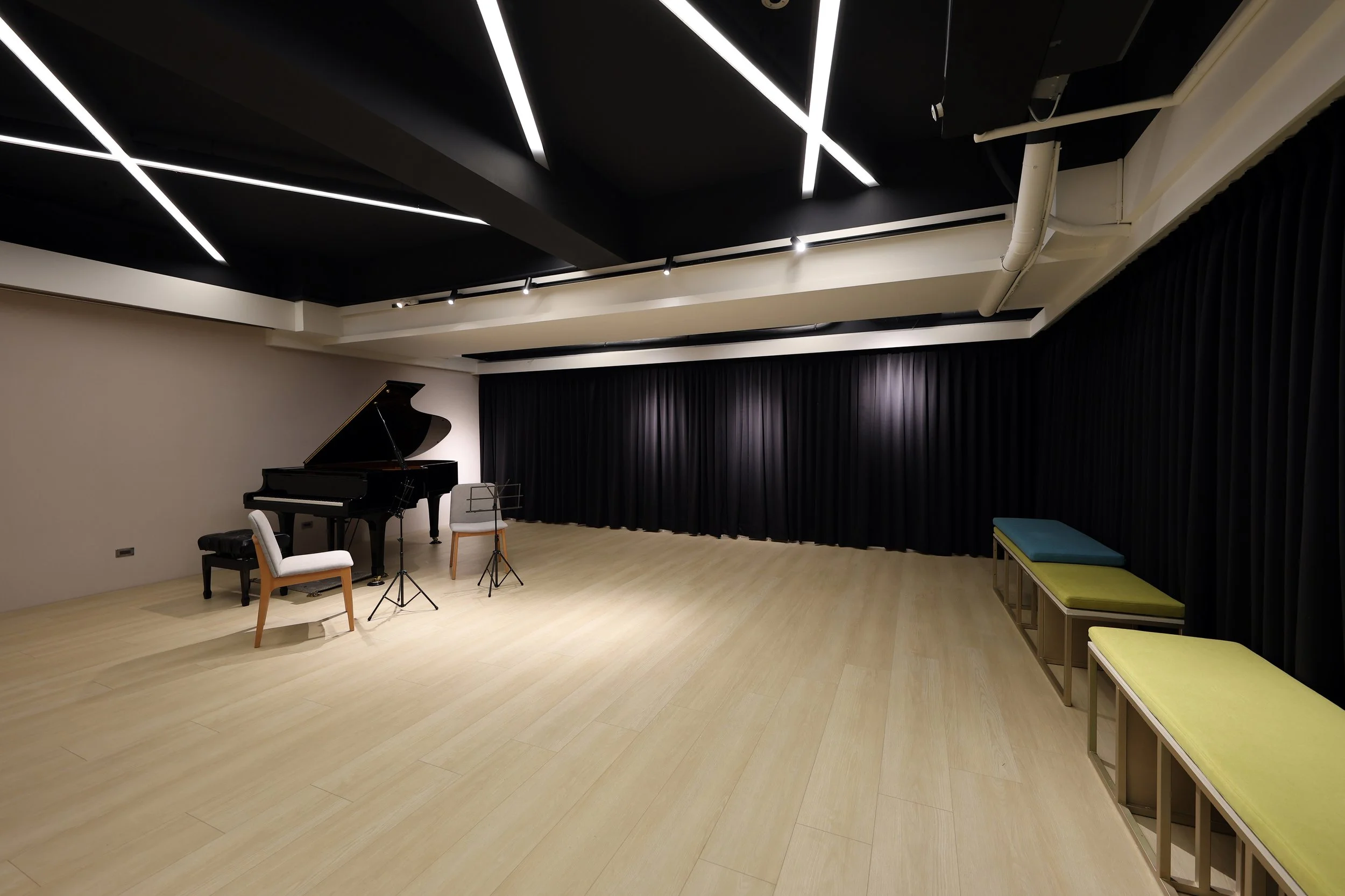 排練室提供:Yamaha C5 平台鋼琴、6張排練椅、6支譜架